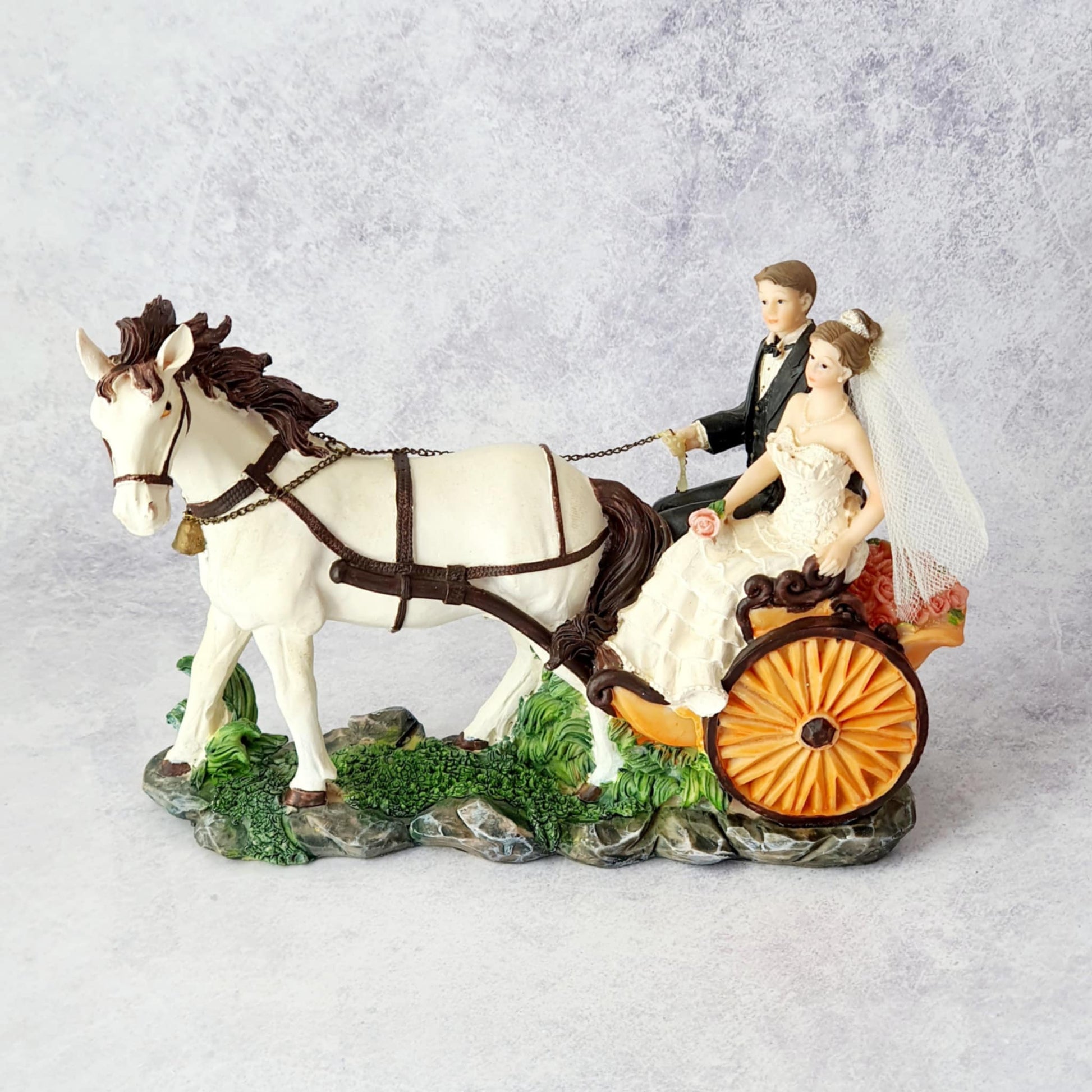 The classic wedding cake topper featuring a couple in a horse-drawn carriage