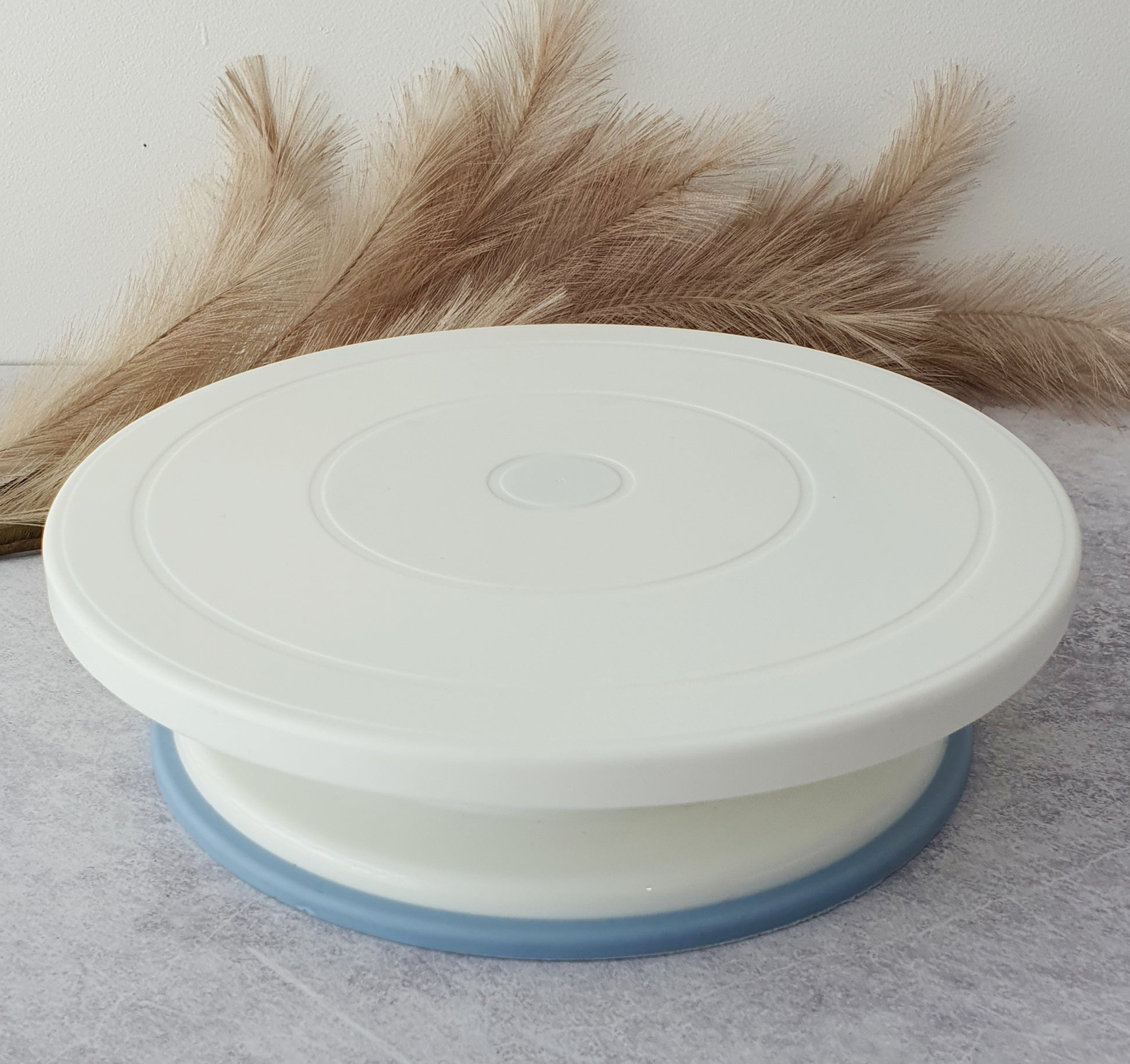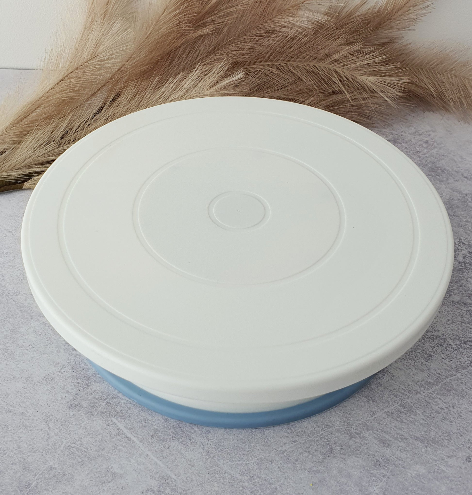 This rotating base is specifically designed for pastries and is based on a convenient storage system. The platform is ideal for working on cakes, photography, 3D modelling, displays, and more. It measures 28 cm (diameter) x 7 cm (height) and features a white plastic body with a blue decorative profile. Its 360° clockwise- and anti-clockwise rotation is manual.