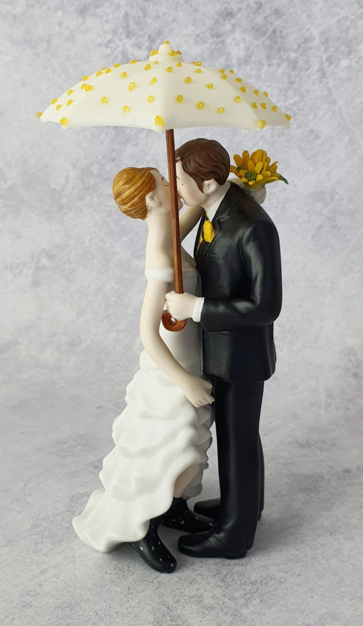 A beautiful dress, a stylish suit, one white umbrella and a great pair of rubber boots all combine to create this very adorable cake topper. Some believe that rain on a wedding day will bring good luck. Regardless, rain or shine, this delightful cake decoration is sure to stand out for all the right reasons. Hand painted porcelain.